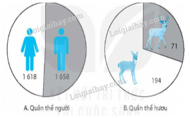 Hãy xác định tỉ lệ giới tính ở quần thể người (1 658 nam, 1 618 nữ) và quần thể hươu (71 cá thể đực, 194 cá thể cái). Từ đó, nhận xét về tỉ lệ giới tính ở hai quần thể này.