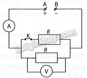 Trong đoạn mạch điện ở hình bên, hai điện trở là giống nhau, công tắc điện K đang ở trạng thái đóng và hiệu điện thế UAB của đoạn mạch được giữ không đổi. Số chỉ của ampe kế và vôn kế thay đổi như thế nào nếu công tắc K bị ngắt?