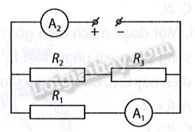 Cho sơ đồ đoạn mạch điện hình bên, trong đó R1 = R2 = R3 = R. Nếu số chỉ của ampe kế A1 là 10 mA thì số chỉ của ampe kế A2 là bao nhiêu?