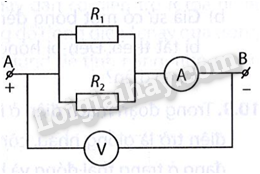 Biết R1 = 80 Ω , R2 = 60 Ω và số chỉ của vôn kế là 24 V. Số chỉ của ampe kế là