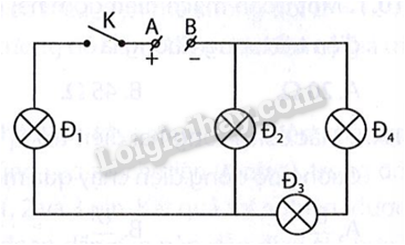 Gọi cường độ dòng điện qua mỗi đèn lần lượt là \({I_1},{I_2},{I_3},{I_4}.\)