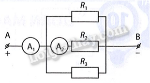 Cho sơ đồ đoạn mạch điện AB như hình bên. Biết R1 = 20 Ω, R2 = 100 Ω, R3 = 40 Ω và các ampe kế có điện trở không đáng kể. Nếu số chỉ của ampe kế A2 là 100 mA thì số chỉ của ampe kế A1 là bao nhiêu?