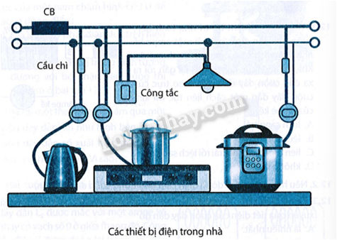 Các thiết bị điện trong hình dưới đây được mắc song song với nhau vào hiệu điện thế 220 V gồm: ấm điện 220 V – 1200 W, bếp điện 220 V – 900 W, nồi cơm điện 220 V – 860 W và một bóng đèn 220 V – 60 W. Trong mạch chính có gắn một cầu dao tự động, còn gọi là CB (CB là từ viết tắt của Circuit Breaker).