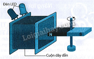 Vì sao khi cho thanh nam châm quay trước cuộn dây dẫn như hình bên thì trong cuộn dây xuất hiện dòng điện xoay chiều (hai đèn LED mắc ngược cực nhau luân phiên chớp sáng)?
