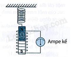 Một thanh nam châm được treo bên dưới một lò xo sao cho nó có thể chuyển động lên xuống tự do bên trong một cuộn được giữ cố định. Cuộn dây được nối với một ampe kế nhạy có vạch số 0 ở giữa thang đo. Kim của ampe kế chỉ như thế nào khi nam châm chuyển động lên xuống tuần hoàn?