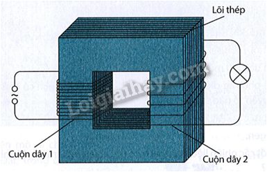 Hình dưới đây mô tả hai cuộn dây dẫn kín được quấn xung quanh một lõi thép. Khi cuộn dây 1 được cấp dòng điện xoay chiều thì bóng đèn mắc với cuộn dây 2 phát sáng. Hãy giải thích vì sao.