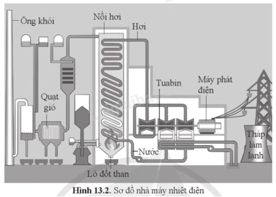 Hình 13.2 là sơ đồ các bộ phận chính của một nhà máy nhiệt điện.