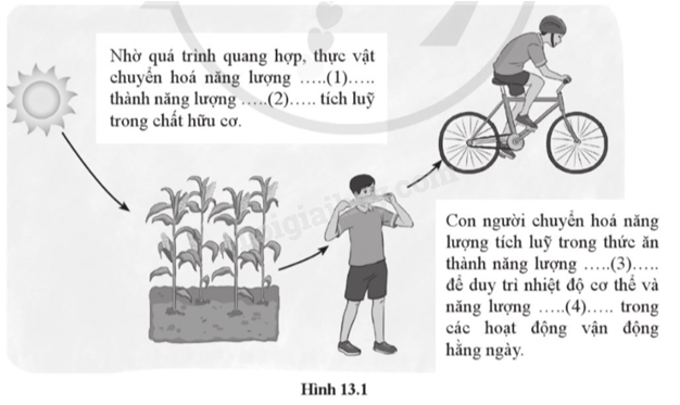 Điền các từ còn thiếu vào chỗ trống để mô tả các quá trình chuyển hoá năng lượng trong hình 13.1.