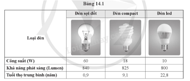 Bảng 14.1 cho biết thông tin về công suất, khả năng phát sáng và tuổi thọ trung bình của ba loại bóng đèn. Nếu cần lựa chọn đèn để lắp đặt hệ thống chiếu sáng cho nhà mình, em sẽ lựa chọn loại đèn nào? Nêu lý do cho lựa chọn đó.