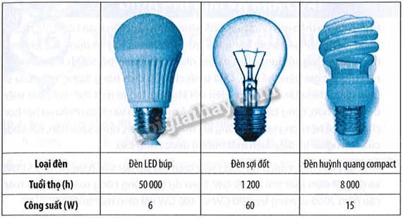 Bảng bên dưới cung cấp thông tin về ba loại bóng đèn khi chúng cung cấp độ sáng tương đương nhau.