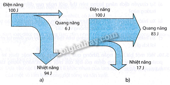 Hình dưới đây là sơ đồ chuyển hoá năng lượng của một bóng đèn dây tóc (hình a) và một bóng đèn LED (hình b).