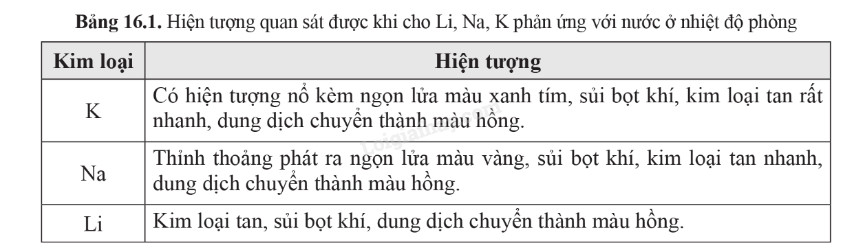 Để so sánh mức độ hoạt động hóa học giữa các kim loại Li, Na, K, người ta cho mẩu nhỏ của mỗi kim loại này vào từng cốc nước riêng biệt có hòa tan vài giọt phenolphthalein. Bảng 16.1 dưới đây mô tả hiện tượng quan sát được.