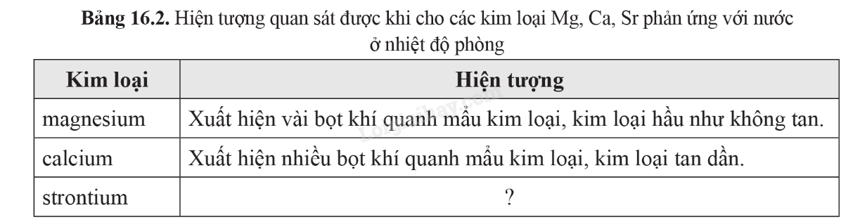 Cho các mẩu kim loại magnesium, calcium, strontium có kích thước tương đương vào cốc nước ở nhiệt độ phòng. Bảng 16.2 ghi một số hiện tượng quan sát được nhưng thiếu thông tin về hiện tượng xảy ra khi cho strontium tương tác với nước.