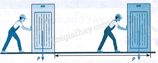 Một người đang đẩy một thùng hàng trượt một đoạn s trên mặt sàn bằng phẳng như hình dưới đây. Hãy cho biết, trong quá trình đẩy, trọng lực P tác dụng lên thùng hàng có thực hiện công không? Vì sao?