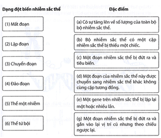 Nối tên của dạng đột biến nhiễm sắc thể với đặc điểm tương ứng.