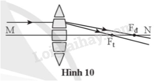 Tia sáng bị tán sắc ánh sáng khi truyền qua lăng kính. So với tia tới, tia đỏ lệch ít hơn và gặp nhau tại tiêu điểm đỏ Fđ ở xa quang tâm hơn; tia tím KM lệch nhiều hơn và gặp nhau tại tiêu điểm tím Ft ở gần quang tâm hơn ( hình 10). Như vậy, chùm tia ló không hội tụ tại một điểm F mà hội tụ thành một dải trong khoảng FtFđ