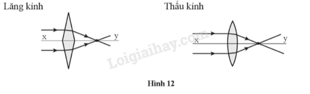 Thiết bị trong hộp có tác dụng làm tia ló lệch về phía trục đối xứng xy nên có thể là lăng kính hoặc thấu kính và được mô tả như hình 12.