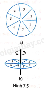 Sử dụng bìa giấy cắt thành một tấm bìa hình tròn, vẽ các hình rẻ quạt liên do tiếp nhau trên mặt bìa, rồi tô màu các hình rẻ quạt ấy lần lượt theo thứ tự (đỏ – 1, da cam – 2, vàng – 3, lục – 4, lam – 5, chàm – 6, tím – 7) như Hình 7.5a. Khoét một lỗ tròn nhỏ giữa tấm bìa sao cho xuyên vừa chiếc bút chì. Dùng tay xoay bút để tấm bìa xoay nhanh dần (Hình 7.5b). Quan sát mặt tấm bìa và cho biết các màu sắc trên mặt tấm bìa thay đổi như thế nào và giải thích hiện tượng.