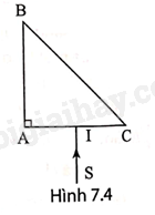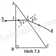 Một tia sáng tới SI vuông góc với mặt AC của một lăng kính (ABC là tam giác vuông cân) như Hình 7.4. Biết tia sáng bị phản xạ toàn phần tại mặt BC bên trong lăng kính. Hãy vẽ tiếp đường truyền của tia sáng qua lăng kính.