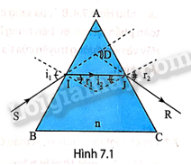 Một tia sáng truyền qua tiết diện thẳng của một lăng kính như Hình 7.1. Góc lệch D của tia sáng có giá trị phụ thuộc các biến số độc lập nào?