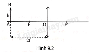 Dựng ảnh A’B’ của một vật AB có độ cao h, đặt vuông góc với trục chính của thấu kính hội tụ và cách thấu kính một khoảng d = 2f (f là tiêu cự của thấu kính) (Hình 9.2).