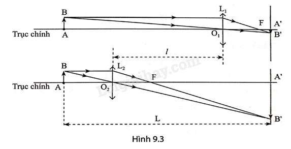 Thực nghiệm cho thấy, với bộ dụng cụ thí nghiệm như Hình 9.1. Khi đã thu được ảnh của vật rõ nét trên màn, nếu giữ cố định khoảng cách giữa vật và màn rồi di chuyển thấu kính trong khoảng giữa vật và màn, người ta sẽ thu được một vị trí nữa của thấu kính cũng cho ảnh rõ nét trên màn như Hình 93.