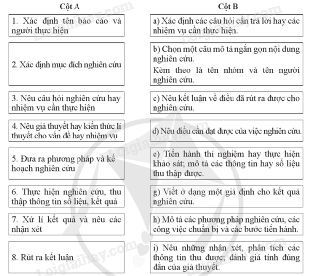 Ghép mỗi bước viết báo cáo khoa học trong cột A với một nội dung ở cột B cho phù hợp.