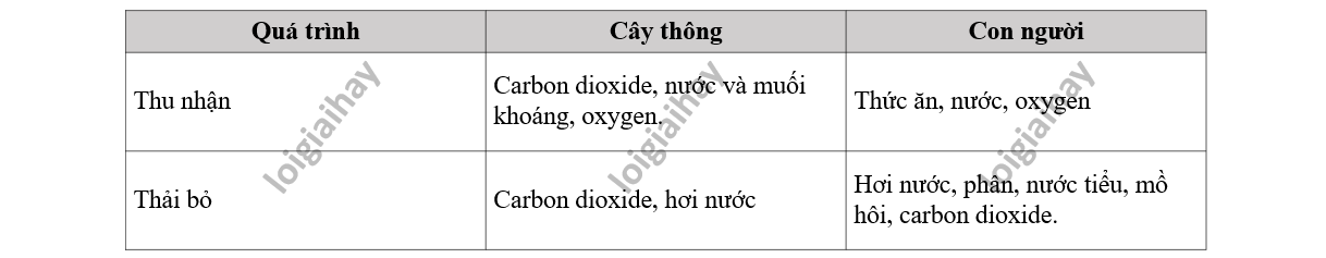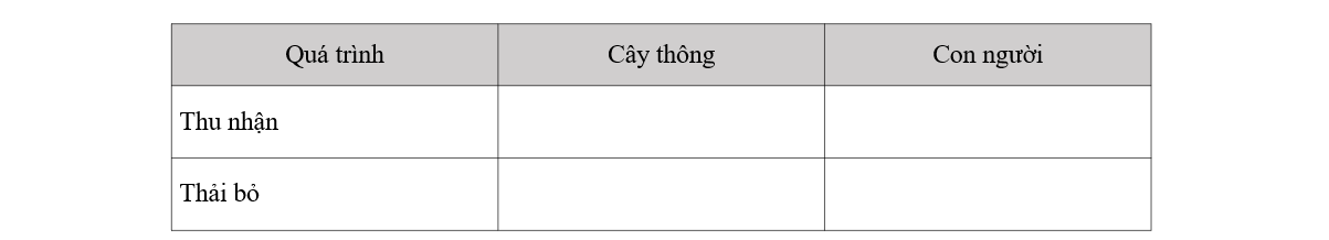 Em hãy liệt kê các chất được thu nhận, thải bỏ trong quá trình trao đổi chất giữa cây thông và con người với môi trường theo gợi ý trong bảng sau đây.