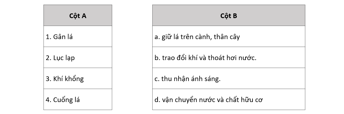 Ghép các bộ phận của lá (cột A) với chức năng tương ứng (cột B) cho phù hợp.