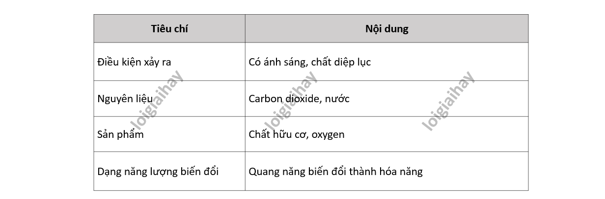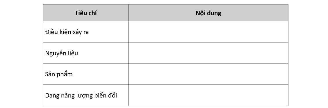 Hoàn thành bảng sau về quá trình quang hợp.