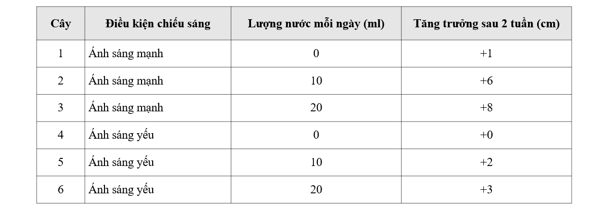 Để tìm hiểu yếu tố nào cần thiết cho sự phát triển của cây, bạn Hà trồng sáu cây trong cả điều kiện ánh sáng mạnh và ánh sáng yếu, đồng thời tưới với lượng nước khác nhau mỗi ngày.