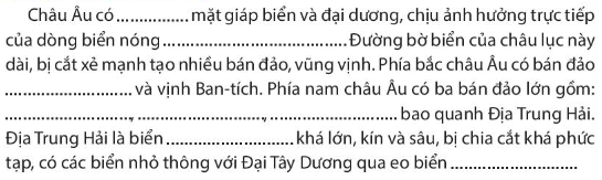 Em hãy liên hệ kiến thức về đặc điểm vị trí địa lí của châu Âu và quan sát hình 1.1 Bản đồ tự nhiên châu Âu trang 97 SGK để hoàn thành thông tin còn thiếu.