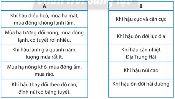 Hãy nối đặc điểm khí hậu (ở cột A) với đới hoặc kiểu khí hậu (ở cột B) cho phù hợp.