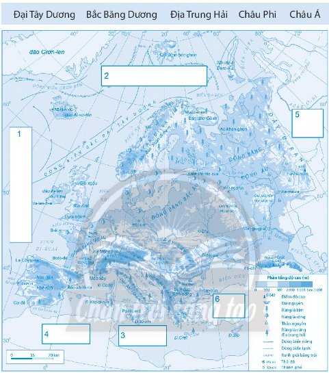 Điền tên các châu lục và đại dương tiếp giáp châu Âu vào hình dưới đây.