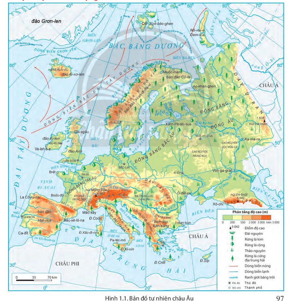 Em hãy liên hệ kiến thức về đặc điểm địa hình của châu Âu và quan sát hình 1.1 Bản đồ tự nhiên châu Âu trang 97 SGK.