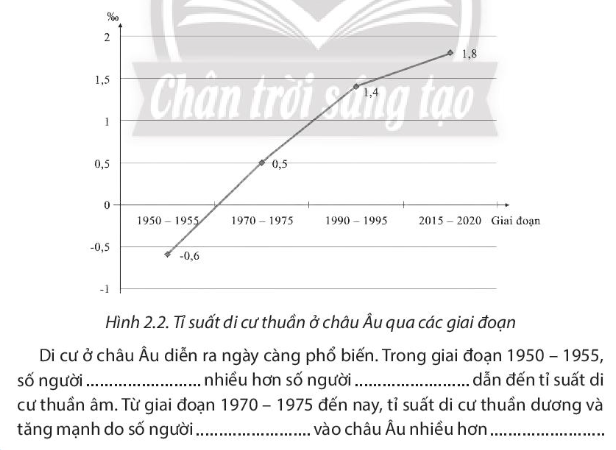 Nhận xét xu hướng tăng dân số châu Âu trong giai đoạn 1950 - 2020. Nhận xét và giải thích sự thay đổi cơ cấu dân số theo nhóm tuổi ở châu Âu trong hai năm trên. Dựa vào hình 2.2 dưới đây, hãy điền từ “nhập cư” hoặc “xuất cư” vào chỗ trống (…) trong đoạn văn dưới đây cho phù hợp. Dựa vào bảng số liệu dưới đây, hãy vẽ biểu đồ thể hiện số dân thành thị hoặc tỉ lệ dân thành thị ở châu Âu giai đoạn 1950 – 2020 và rút ra nhận xét.