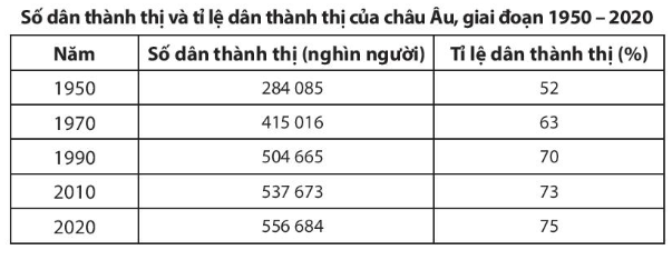 + Tỉ lệ dân thành thị tăng từ 52% năm 1950 lên 75% năm 2020: tăng 23%. Như vậy, chứng tỏ châu Âu có mức độ đô thị hóa cao với 75% số dân sống trong các đô thị (năm 2020).