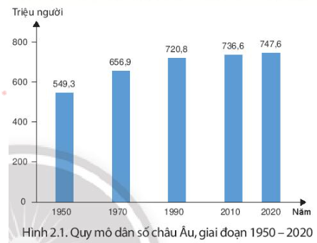 + Quy mô dân số châu Âu trong giai đoạn 1950 - 2020 có xu hướng tăng qua các năm: Năm 2020, dân số châu Âu đạt khoảng 747,6 triệu người (chiếm gần 10% dân số thế giới).