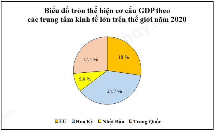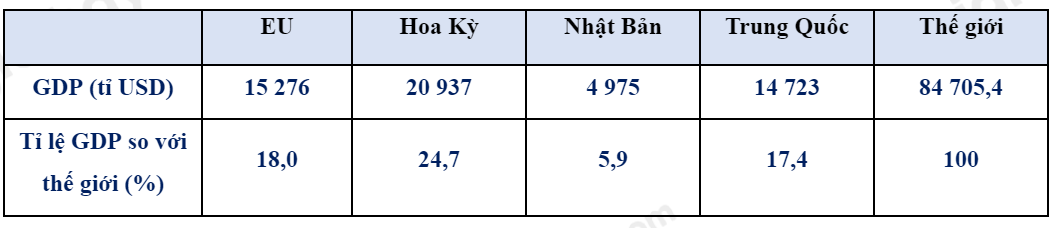 Từ bảng số liệu, ta thấy GDP của EU đứng thứ hai trong bốn trung tâm kinh tế lớn trên thế giới, đạt 15 276 tỉ USD (năm 2020).