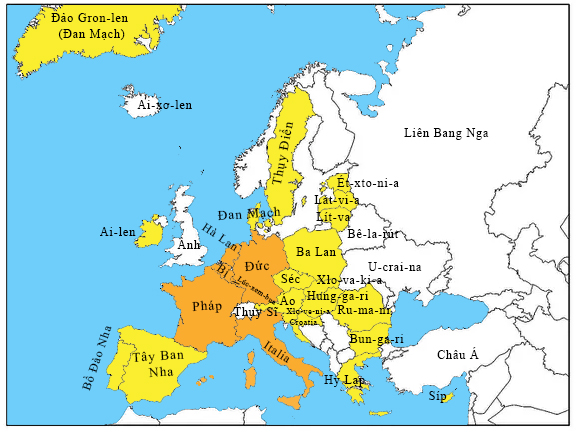 - Tô màu cam vào các nước sáng lập Liên minh châu Âu gồm: Đức, Pháp, I-ta-li-a, Hà Lan, Bỉ, Lúc-xem-bua trong bản đồ dưới đây.