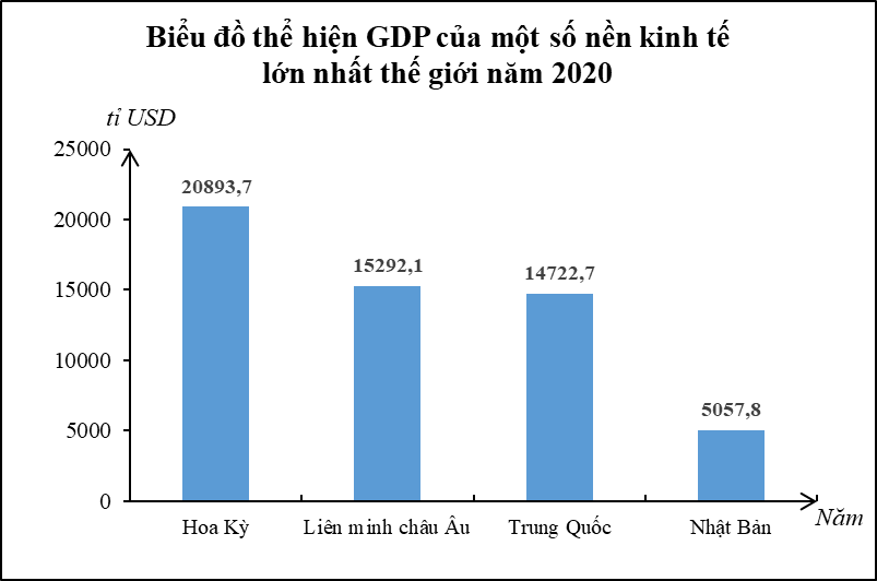 - Nhận xét: GDP của một số nền kinh tế lớn nhất thế giới năm 2020 có sự khác nhau rõ rệt. Trong đó Hoa Kỳ đứng đầu thế giới với GDP đạt 20,8 nghìn tỉ USD, đứng thứ 2 là liên minh châu Âu (15,2 nghìn tỉ USD), tiếp đó là Trung Quốc (14,7 nghìn tỉ USD), Nhật Bản đứng cuối với 5 nghìn tỉ USD.