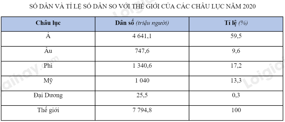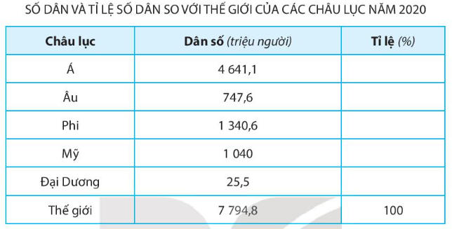 Tỉ lệ số dân so với thế giới (%) = (Số dân của châu lục/Tổng số dân toàn thế giới)x 100