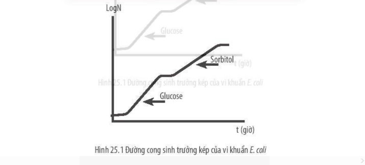 Hình 25.1 mô tả đường cong sinh trưởng kép của vi khuẩn E. coli trong môi trouongf có 2 nguồi carbon là glucose và sorbitol. Điều kiện để xảy ra quá trình phân hỷ sorbitol là gì?
