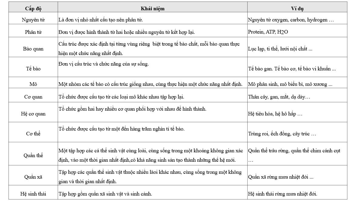 Các đơn vị cấu tạo nên thế giới sống được gọi là cấp độ tổ chức của thế giới sống.