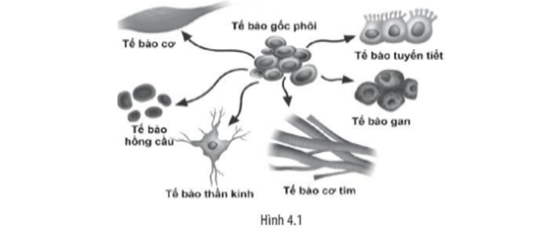 a) Hình 4.1 mô tả quá trình biệt hóa tế bào. Do từ tế bào gốc phôi đã hình thành nên các loại tế bào khác nhaucó chức năng nhất định.