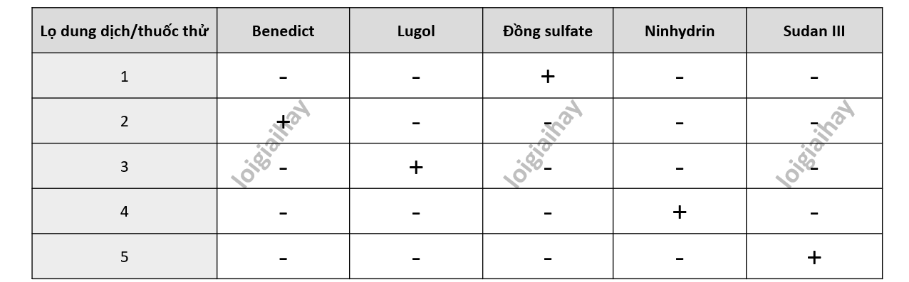 Một bạn học sinh đã quên dán nhãn tên cho năm lọ dung dịch nên gặp khó khăn trong việc cất chúng đúng vị trí. Sau đó, bạn cho tiến hành thích nghiệm để xác định tên của mỗi loại dung dịch đó với 5 loại thuốc thử khác nhau. Kết quả thu được bạn ghi nhận ở bảng dưới đây. Biết (+) là kết quả dương tính; (-) là kết quả âm tính.