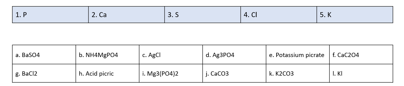Hãy ghép đúng hợp chất được tạo ra khi tiến hành nhận biết sự có mặt của một số nguyên tố khoáng trong tế bào.