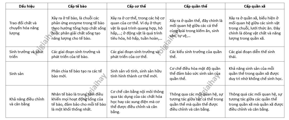 Lập bảng phân biệt các cấp tổ chức của thế giới sống: tế bào, cơ thể, quần thể, quần xã.