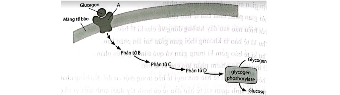 a) Các yếu tố tham gia quá trình truyền tin này: phân tử tín hiệu (glucagon), thụ thể của glucagon, tế bào đích (tế bào gan). Phân tử A là thụ thể của glucagon; các phân tử B, C, D là các phân tử truyền tin nội bào.