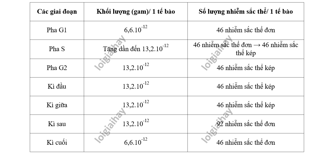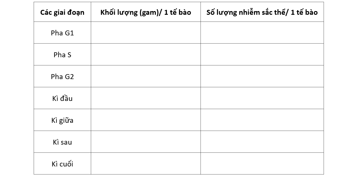 Một tế bào sinh dưỡng của người có khối lượng DNA là 6,6.10-12 gam và có 46 nhiễm sắc thể. Hãy điền vào bảng sau về khối lượng DNA và số lượng nhiễm sắc thể đơn và nhiễm sắc thể kép ở mỗi giai đoạn trong một chu kì tế bào.
